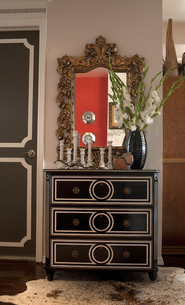 This precious space was occupied by that closet with wash and drier. The inlaid dresser is from Lerebours Antiques, the Greek key base echoes the Greek key crown molding on the door and it's a find from Home Goods.